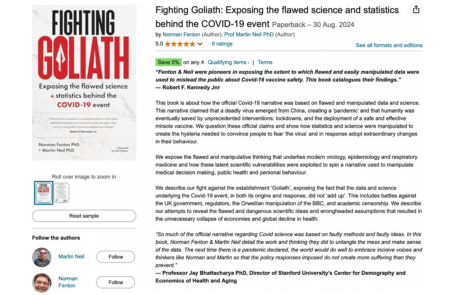 Along with his colleague Prof Martin Neil — who features in part 2 of this article, available in a few days time all being well — Fenton has written a book entitled Fighting Goliath: Exposing the flawed science and statistics behind the COVID-19 event: