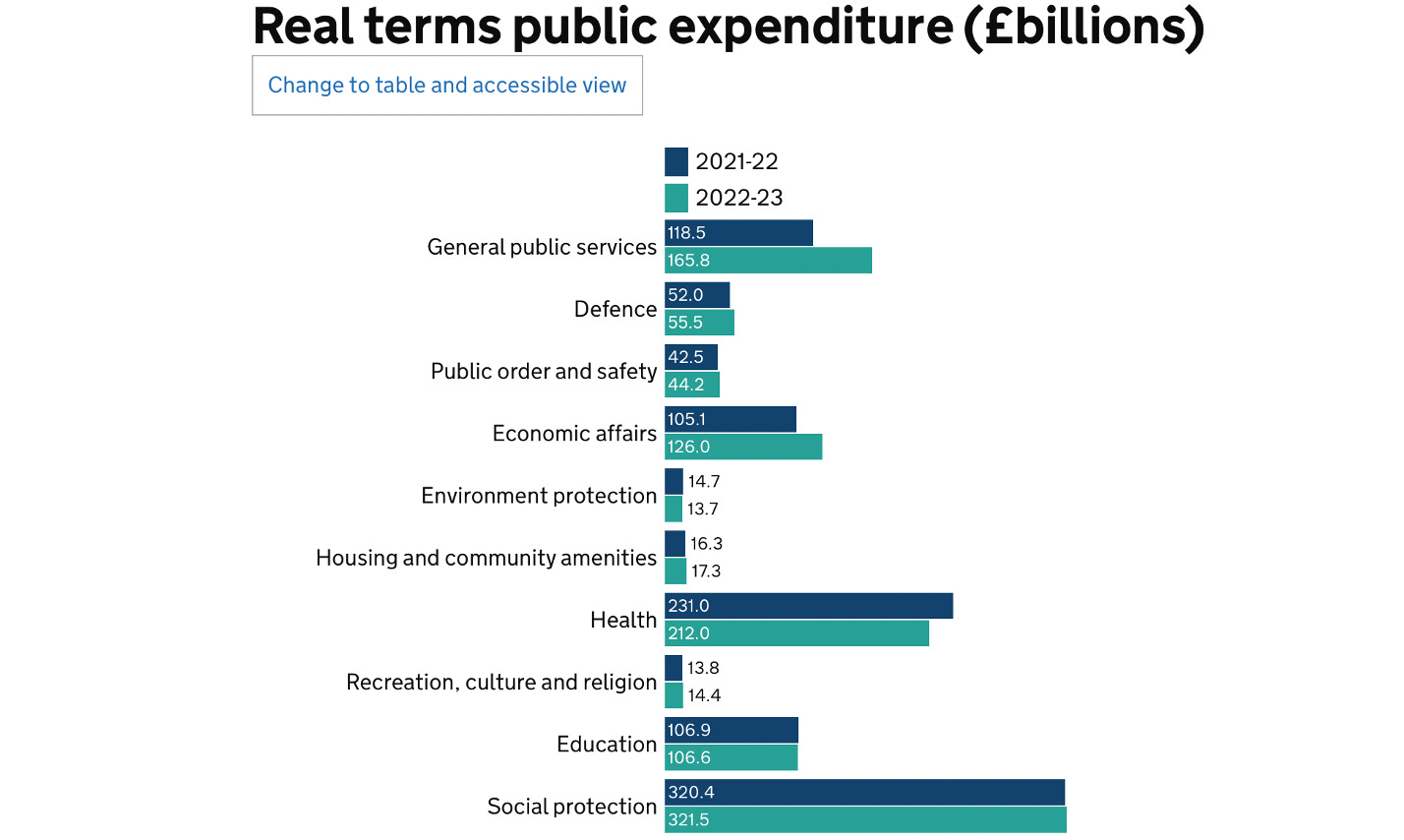 To put that almost ~£40 billion into perspective, here is the breakdown of UK government real terms public expenditure (£billions) for 2021-22 and 2022-23: