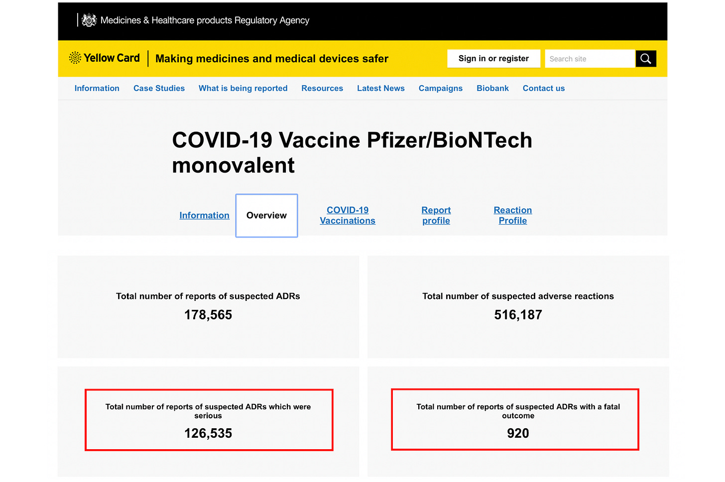 And for comparison, here is information from the same UK government Yellow Card website for the mRNA-based Pfizer/BioNTech monovalent covid vaccine (~100 million doses):