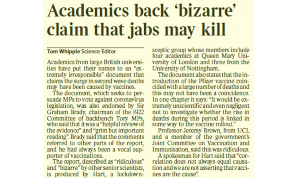 So we had a real problem getting this message out. And the sad thing about this — and this is not just us; this applied to everybody who was challenging the narrative — [is that] very early on [in] 2021… when you had the mass vaccine program… from January, February there, we were looking at the early data that the ONS were publishing. And we were seeing these spikes in mortality and the different age groups which the ONS were claiming were occurring in the unvaccinated. But the problem was [that there were] spikes… in the non-covid mortality, so we flagged there was a safety signal right from the start. And [then] there was [an article] in The Times calling us mad conspiracy theorists and stuff like that. So that message never went out.